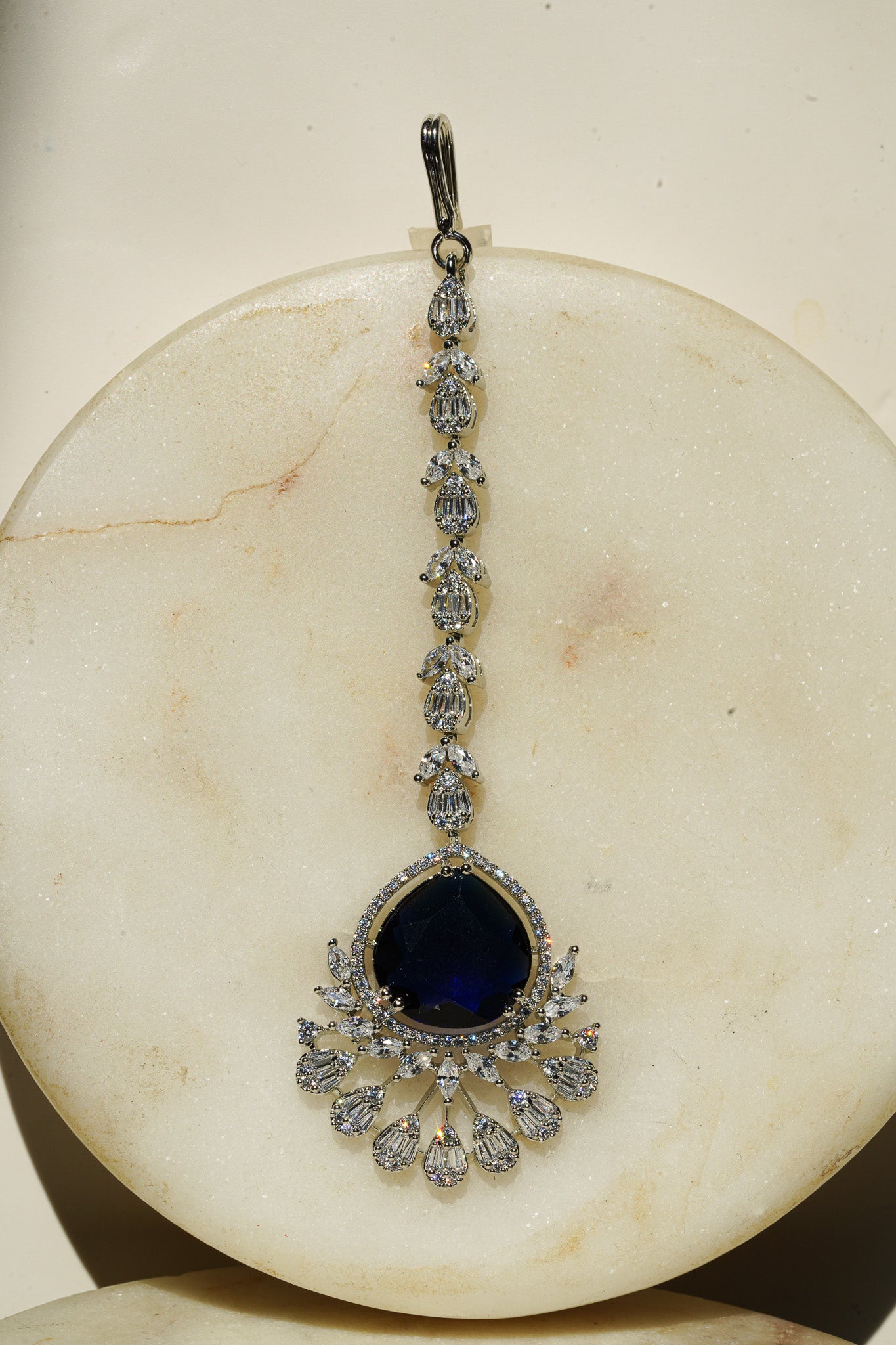 - Silver finish with sapphire blue stones