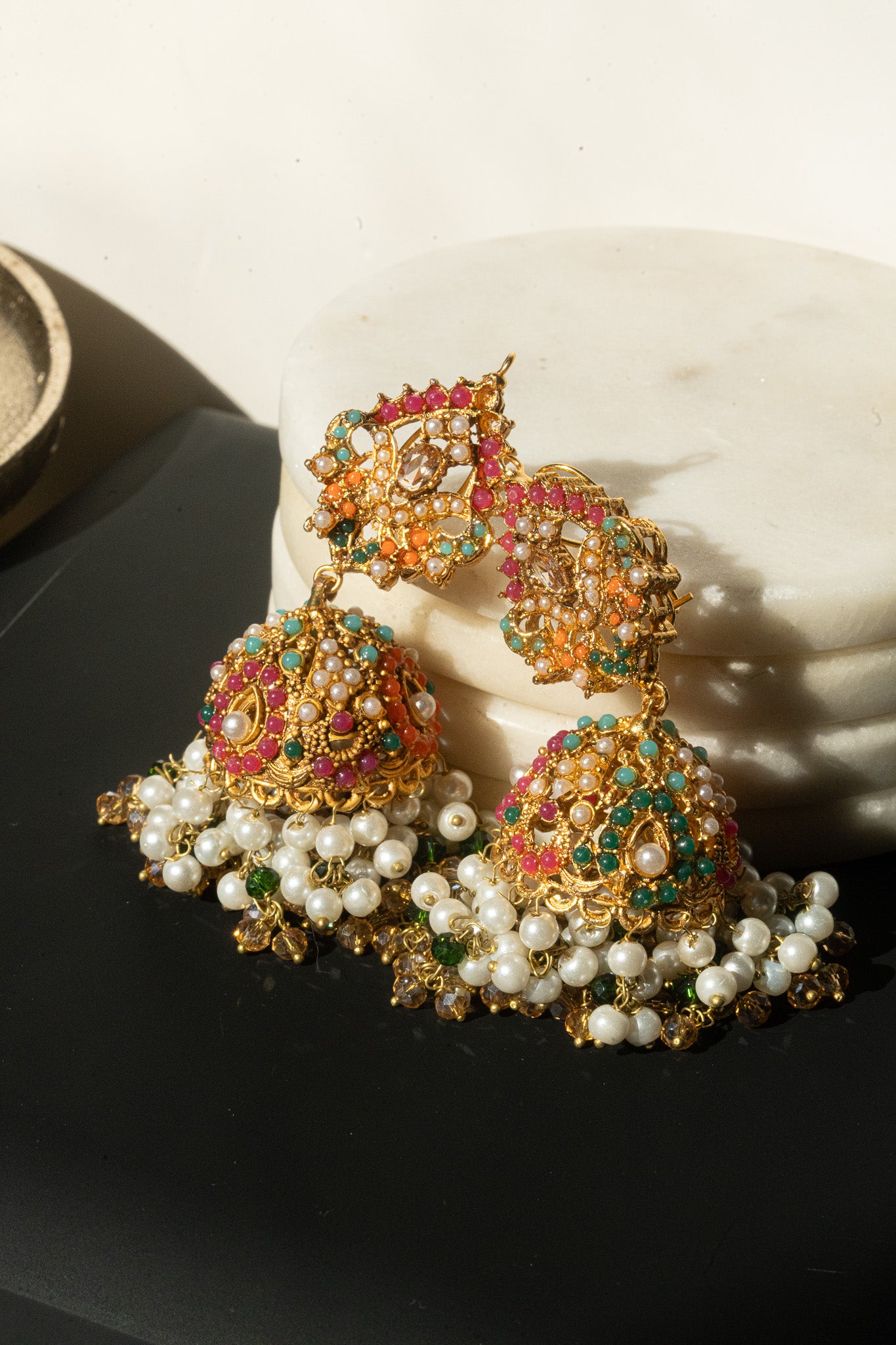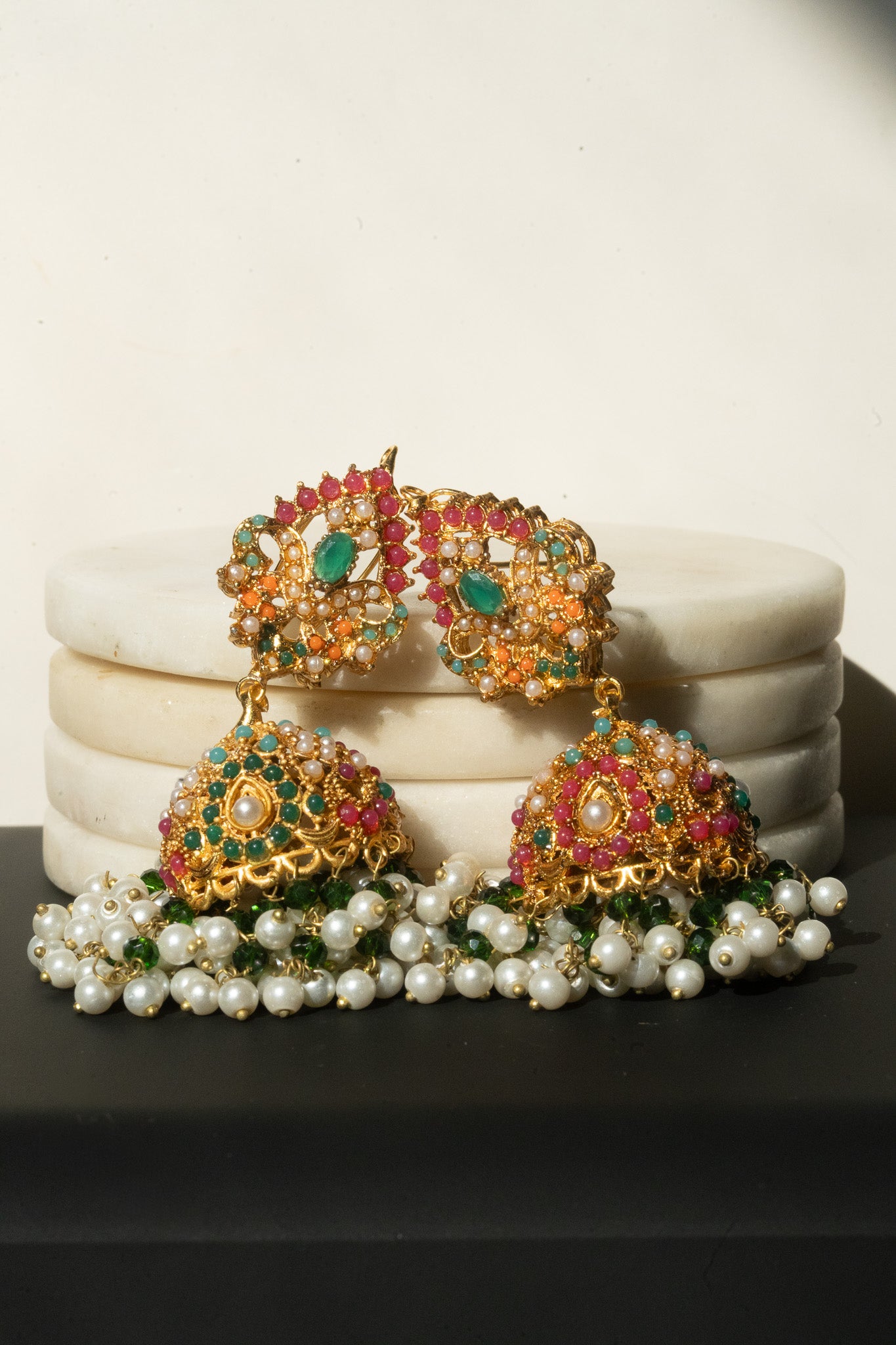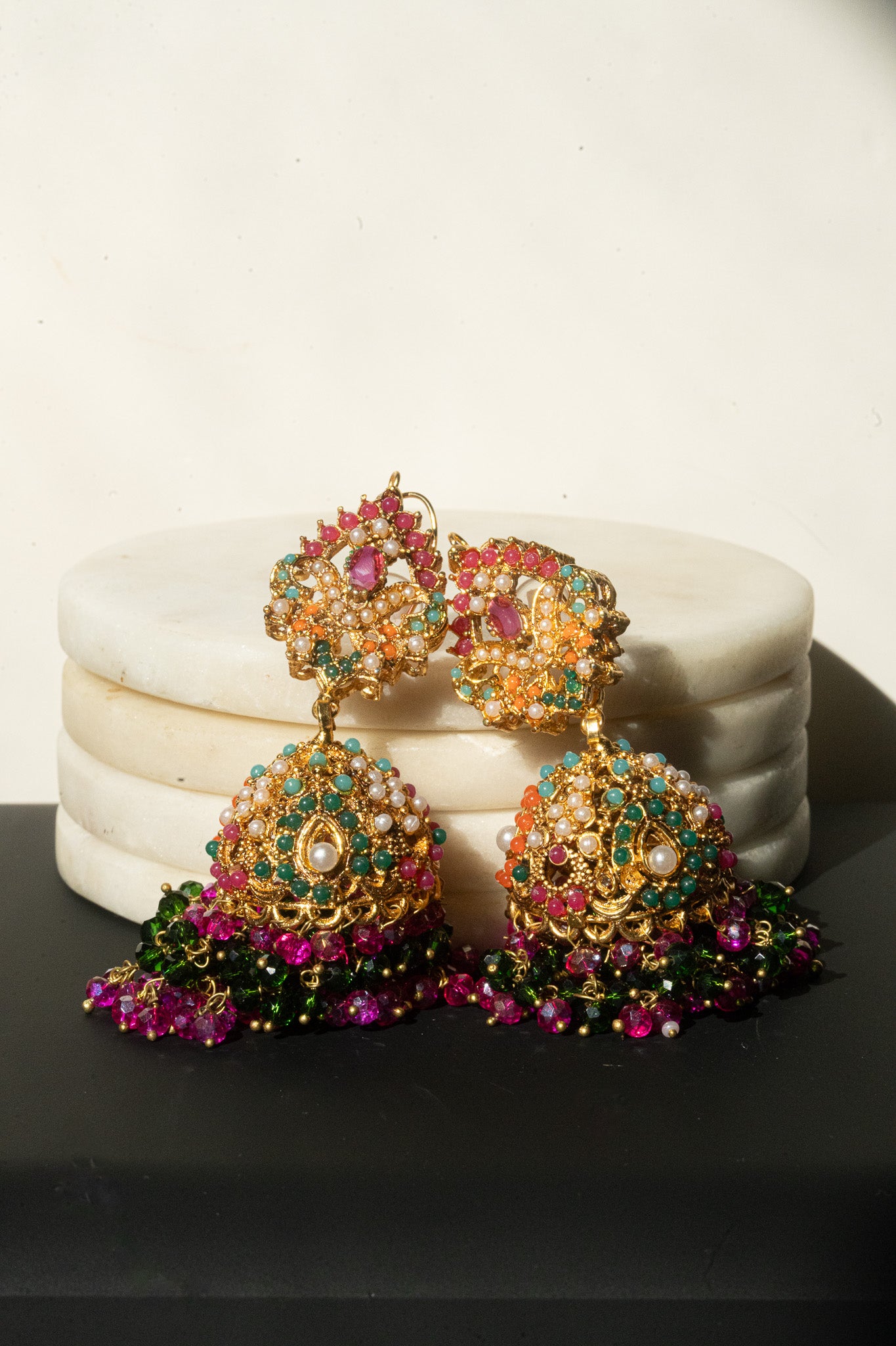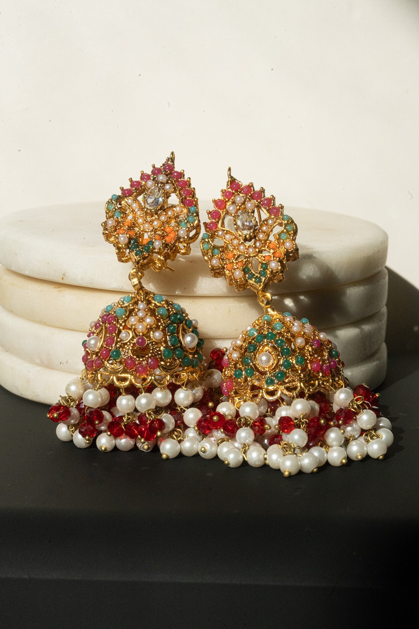 Each pair is finished with a high-quality matte gold plating, providing a luxurious, non-reflective surface that makes the multicolor zircon stones pop. The intricate design of the jhumka bell is lightweight and comfortable for all-day wear.
