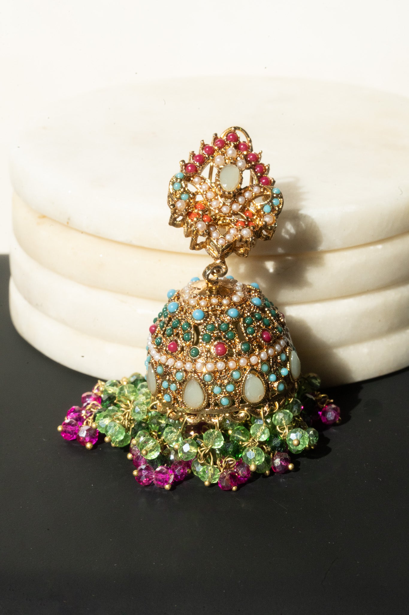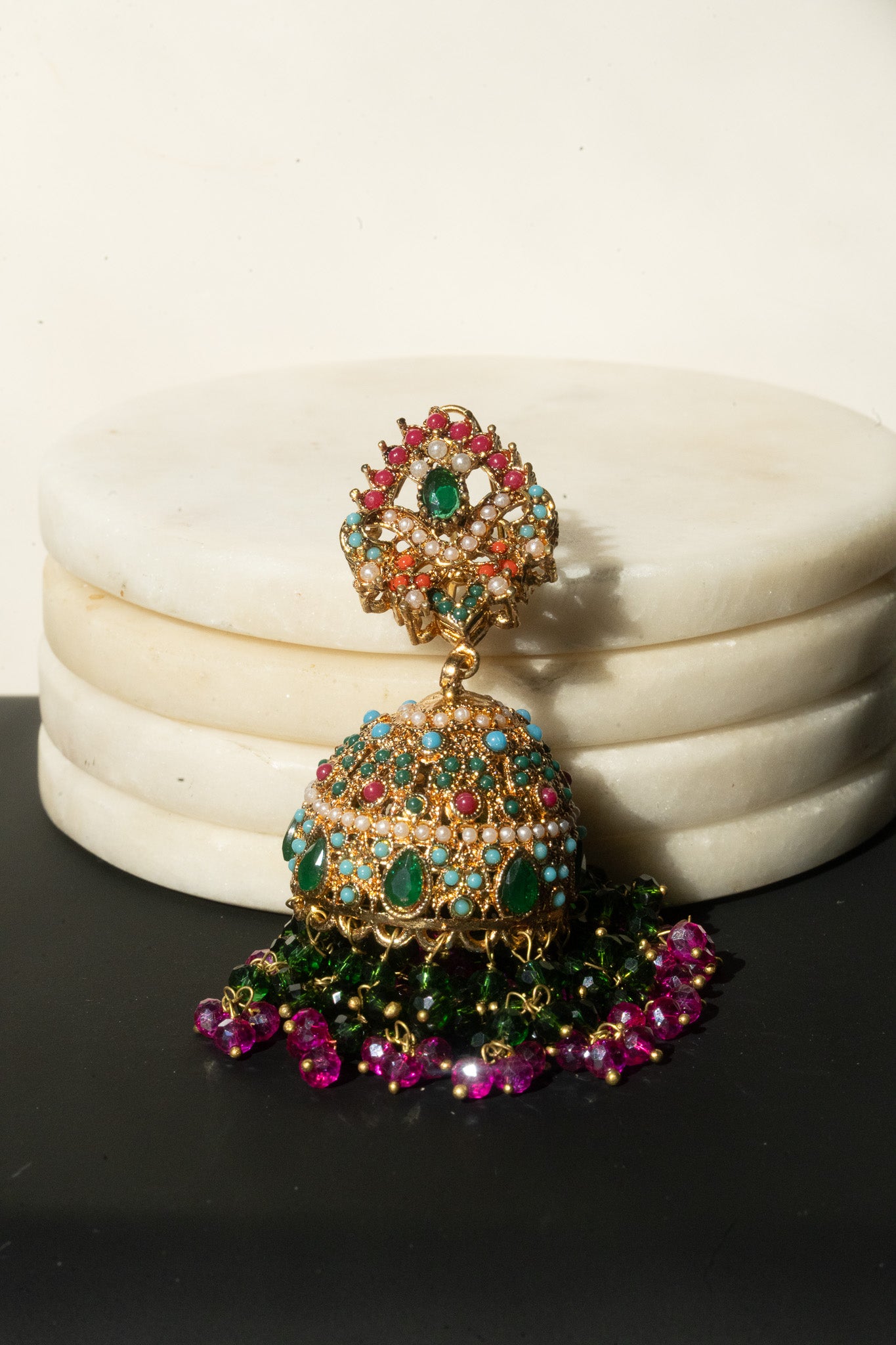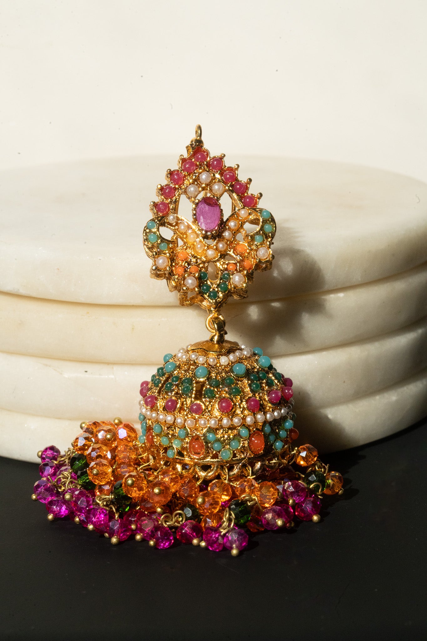 Sahana - Matte Gold Plated Multicolor Navratan Jhumka Earrings