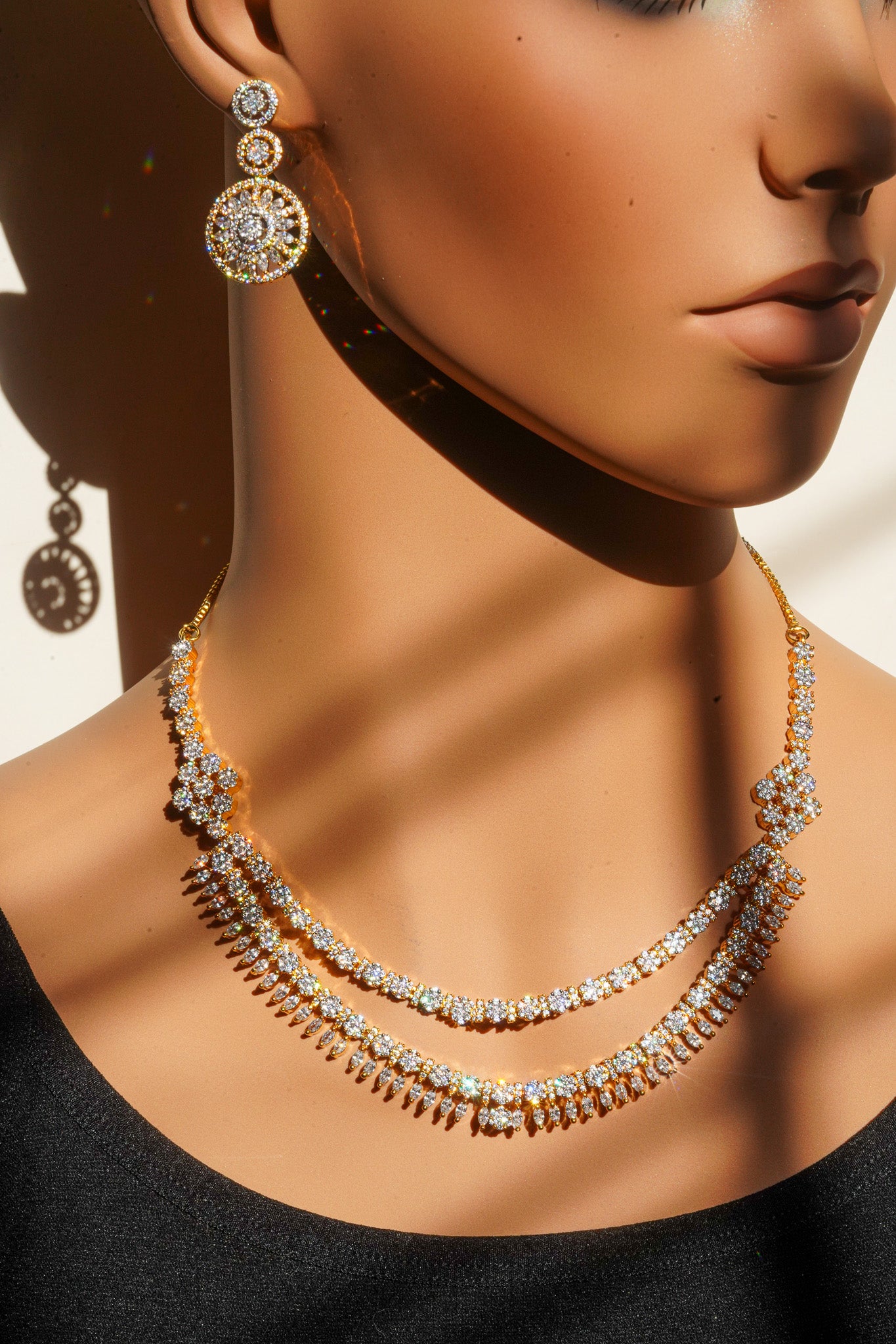 Complementing this stunning necklace are the accompanying earrings, meticulously crafted to mirror the set's finesse and charm. Despite its luxurious appearance, this necklace set is remarkably lightweight, ensuring comfort without compromising its luminous luster and captivating sparkle.