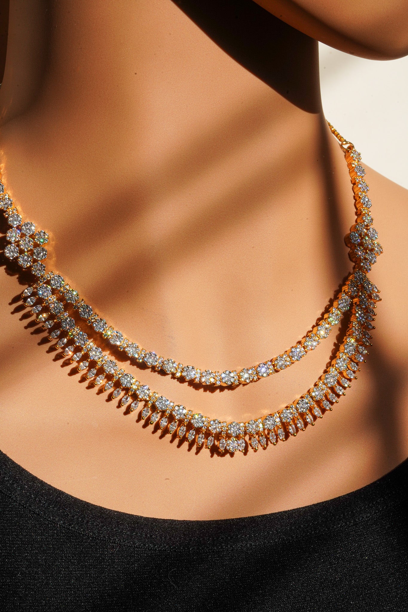 - Elegant Design: Double-layered necklace with intricate floral cut patterns and radiant AD stones.