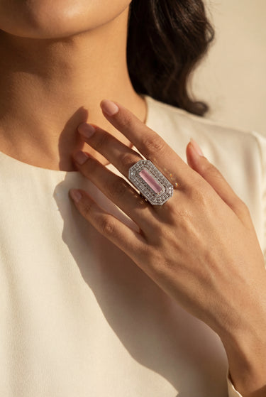 Make a bold statement with these stunning baguette-cut cocktail rings, crafted to exude modern sophistication and timeless glamour. Each ring showcases a radiant rectangular center stone available in captivating colors—vivid ruby, sapphire blue, mint green, and blush pink and each of them encased in a halo of dazzling baguette-cut stones.