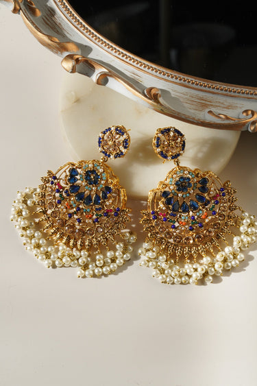 This oversized Earring & Maang Tikka Set is adorned with nine exquisite gemstones representing the Navratnas, symbolizing a perfect blend of heritage and high-impact glamour. Each piece is richly gold-plated over a durable brass base, offering a radiant shine and premium finish that lasts.