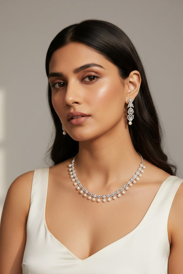 Embrace timeless elegance with the Aditi Flora Pearl & Diamante Necklace Set, a stunning Indian jewelry piece featuring delicate floral vine detailing. This collar-length set showcases intricate AD stone clusters with graceful pearl drops, creating a refined statement perfect for wedding receptions, anniversaries, and formal celebrations.