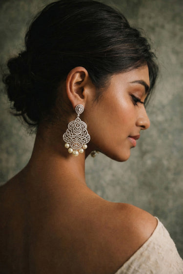 The Irene Radiant Pearl Drop Earrings are a stunning blend of elegance and sophistication. These meticulously designed earrings feature intricate rhodium-plated filigree patterns, encrusted with shimmering pavé white stones, creating a captivating sparkle. Delicately adorned with lustrous pearl drops, these earrings radiate timeless charm. With a lightweight build and push-back closure, they offer comfort without compromising on style, making them perfect for festive occasions, weddings, or adding a regal touch to your everyday attire.