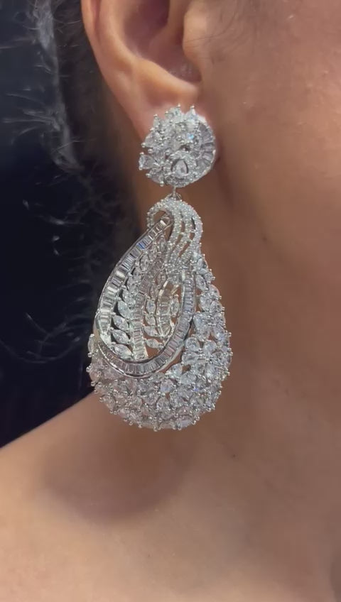 Iqra - Rhodium-Plated Indian Statement Earrings with White Diamante Accents