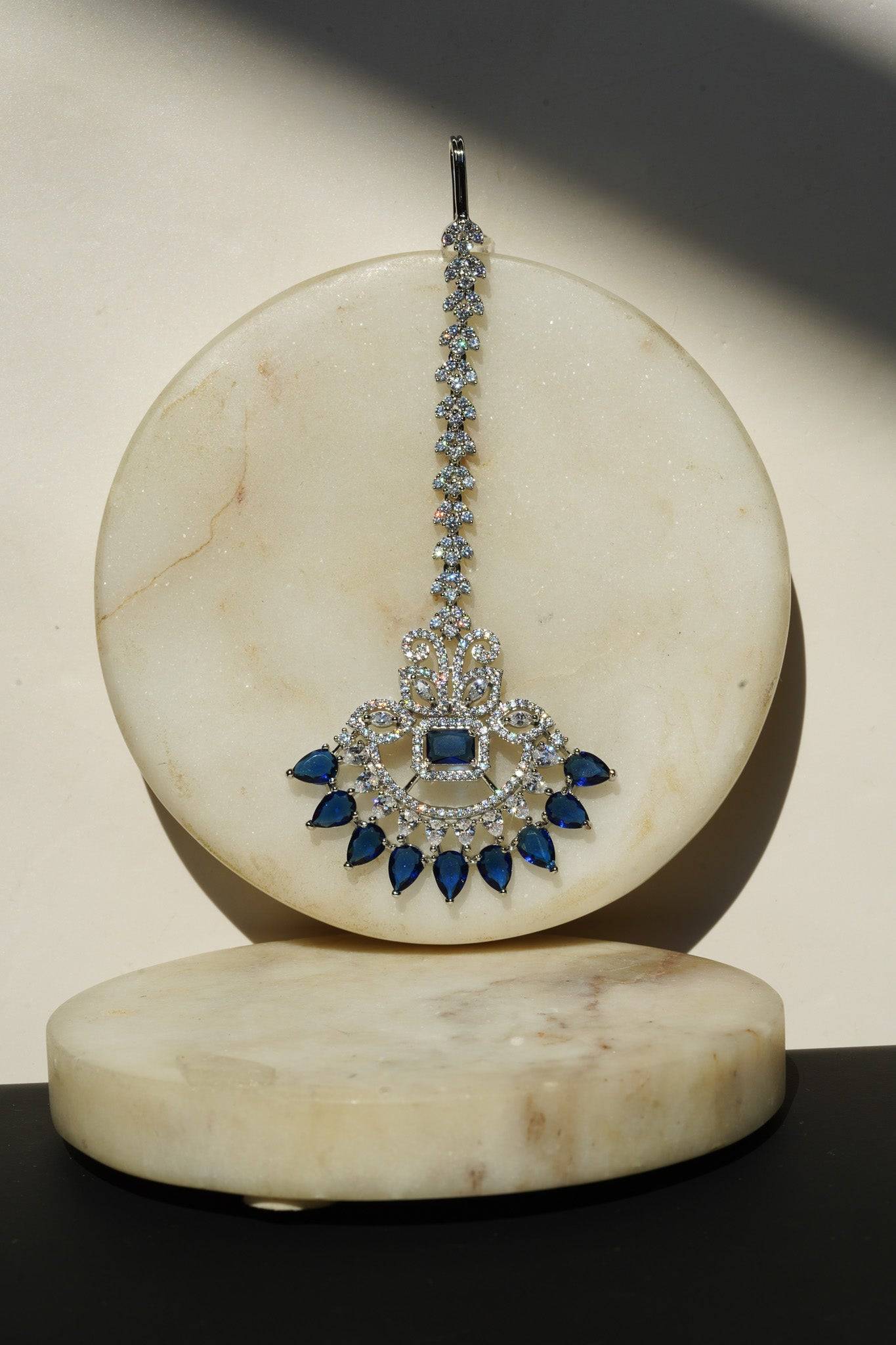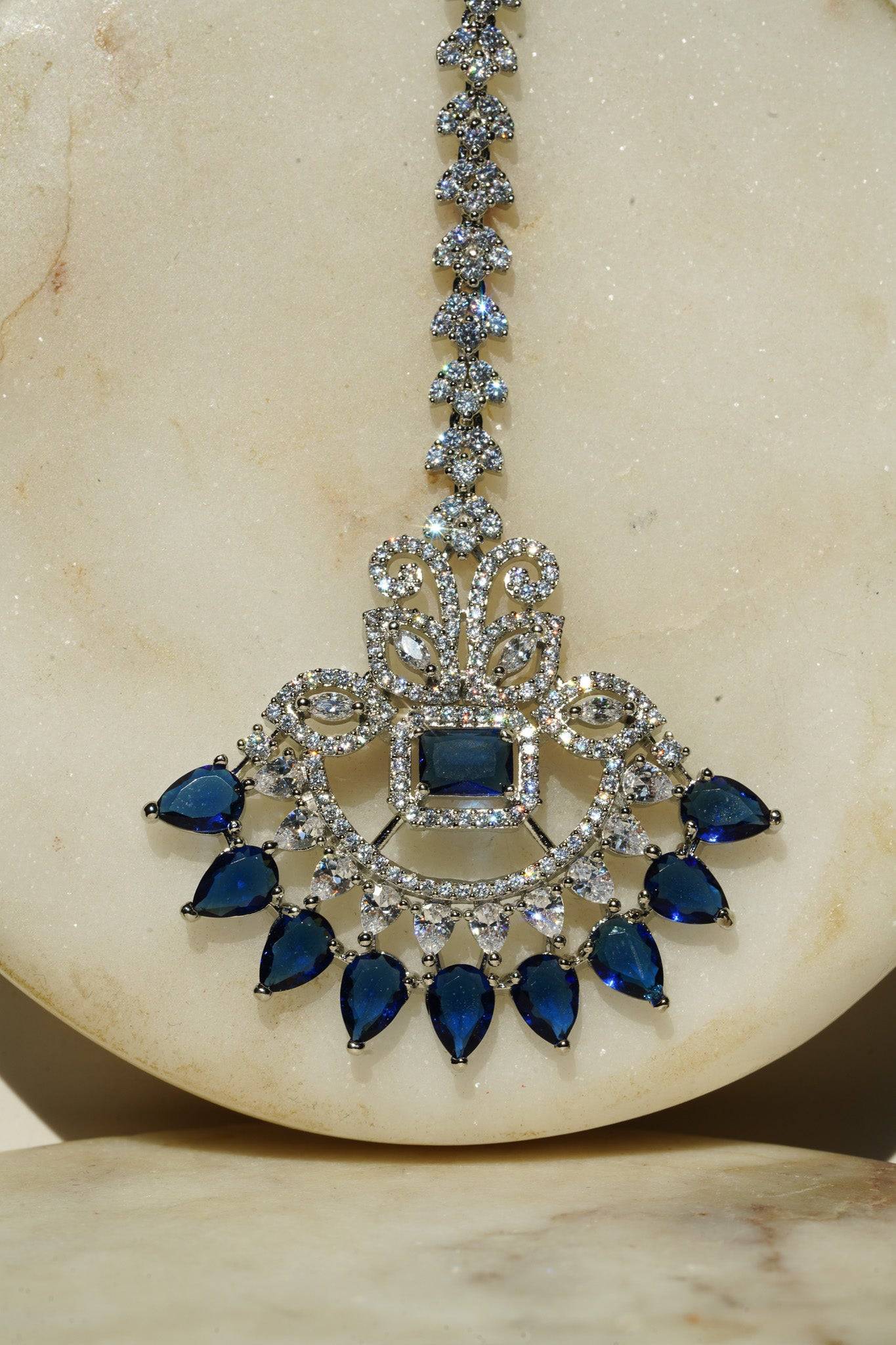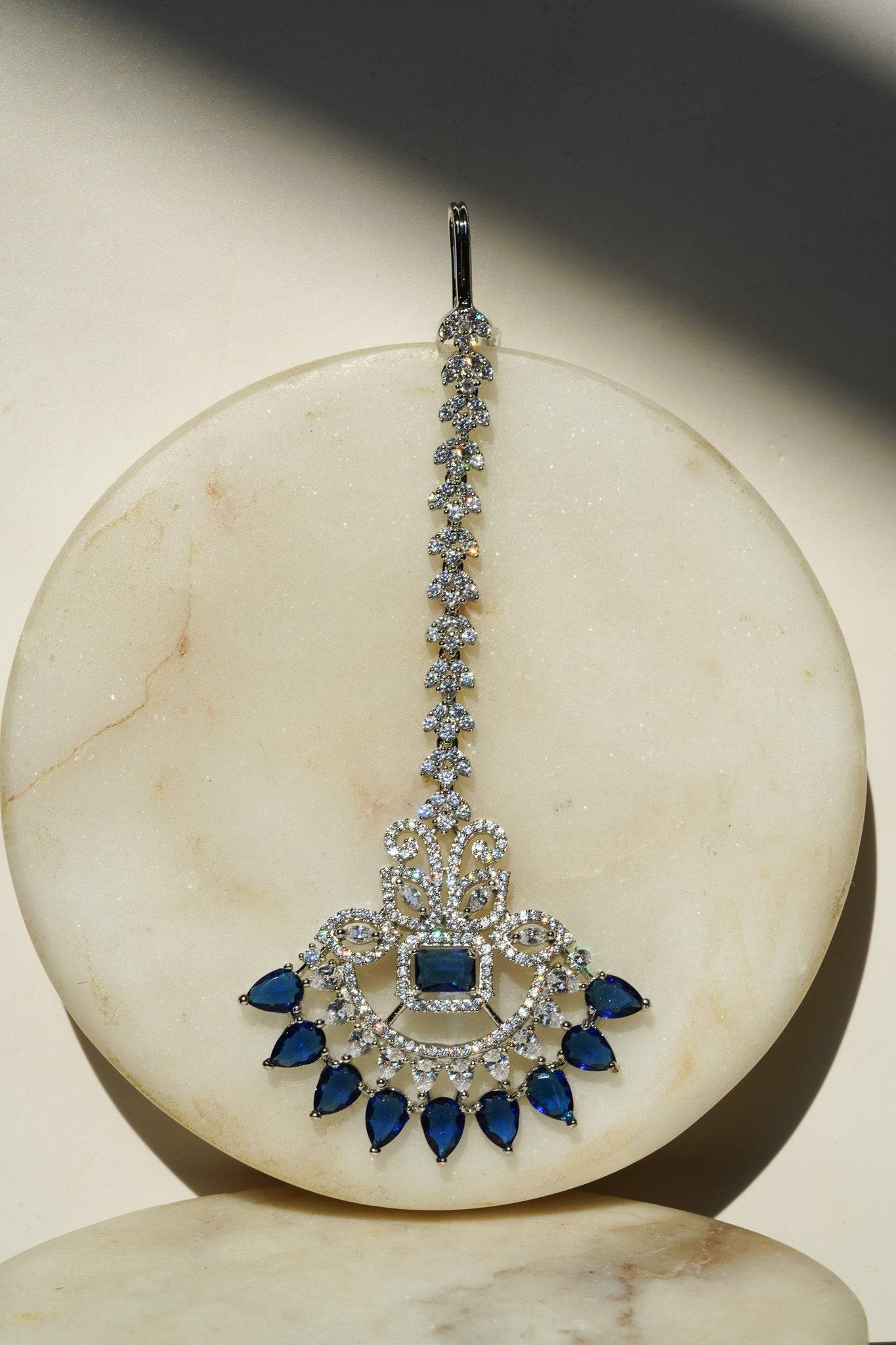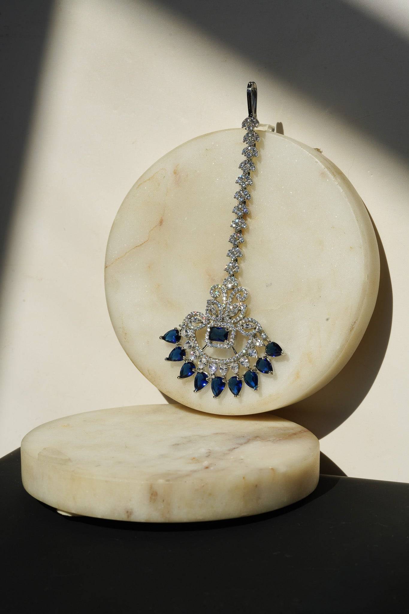 Isata Sapphire Blue Maang Tikka - Bollywood Style Rhodium AD