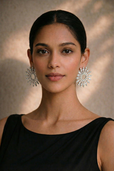 The Sitara Earrings radiate brilliance and elegance, making them the perfect choice for any occasion. These meticulously crafted rhodium-plated earrings feature a striking sunburst design with intricate pavé-set stones that shimmer like celestial stars. At 2.3 inches long, they provide a statement-making presence while remaining lightweight and comfortable to wear. The earrings are fitted with secure hook backs for effortless styling and all-day support.