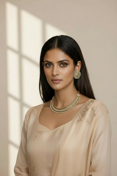 Indulge in timeless elegance with the Sabhan Classic Artisan Crafted Necklace Set featuring Oversized Stud Earrings. This gold-plated ensemble, adorned with white zircon stones, is available in two captivating color options. Choose from the classic gold and pearl version, where both the necklace and stud earrings feature a delicate pearl trim, or opt for the chic gold and black option, featuring a black bead trim for a sophisticated edge. The adjustable string on the necklace ensures a perfect fit, making this necklace set ideal for those who appreciate a traditional look with a chic twist.