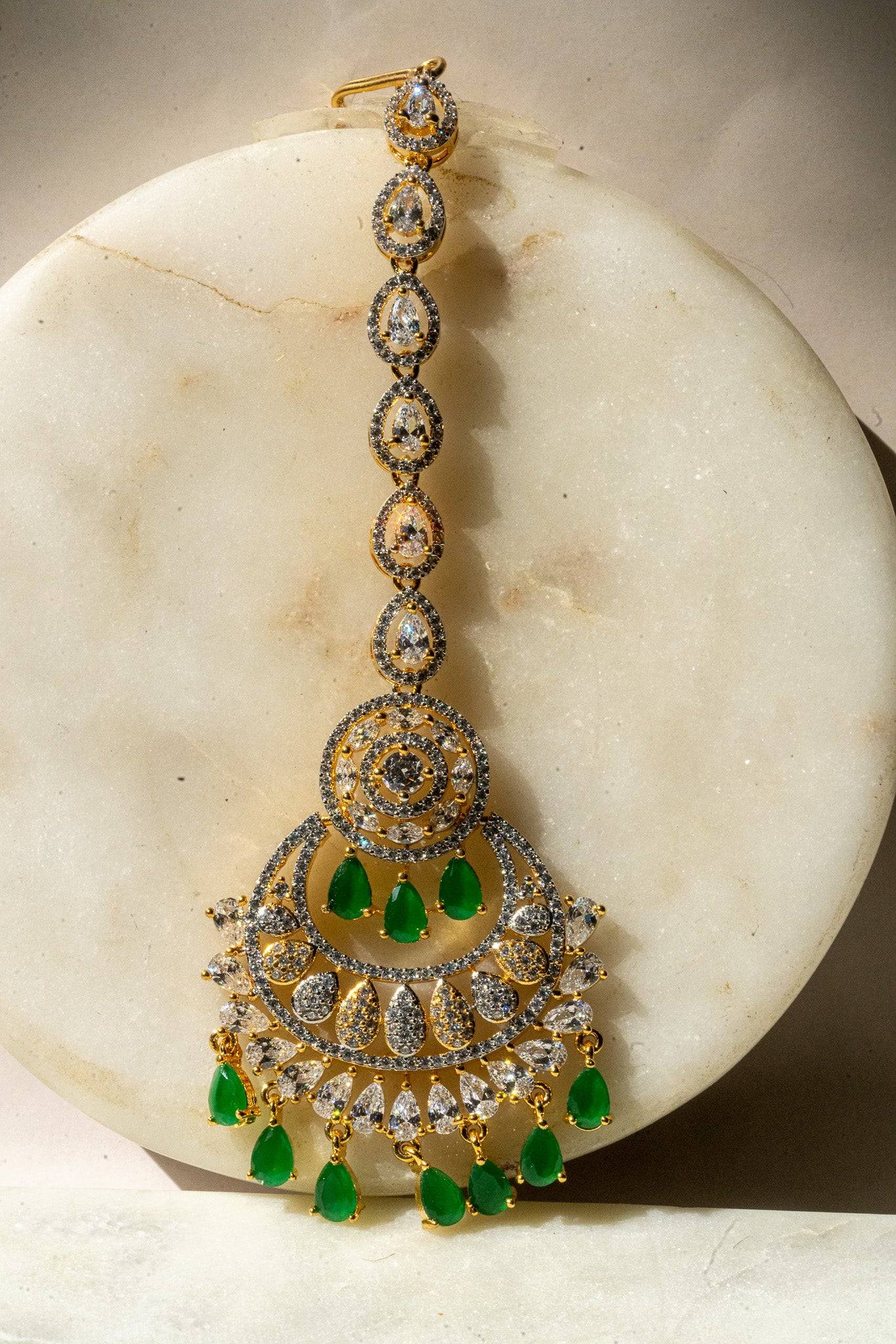 - Color Options: Maang tikka is available in green (not dark green), ruby red, baby pink, and sapphire blue.