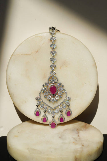 - Style Keywords: Statement Maang Tikka, Rhodium AD Headpiece, Ruby Pink Jewelry