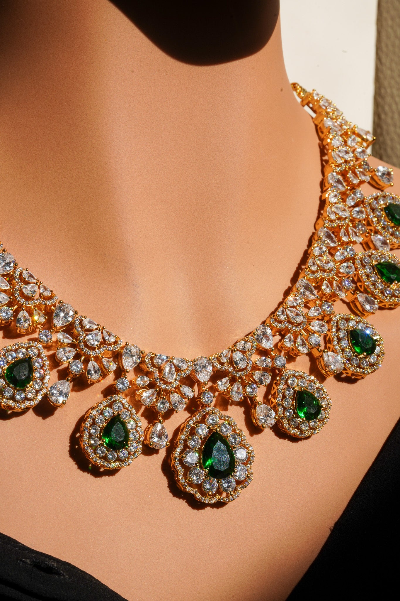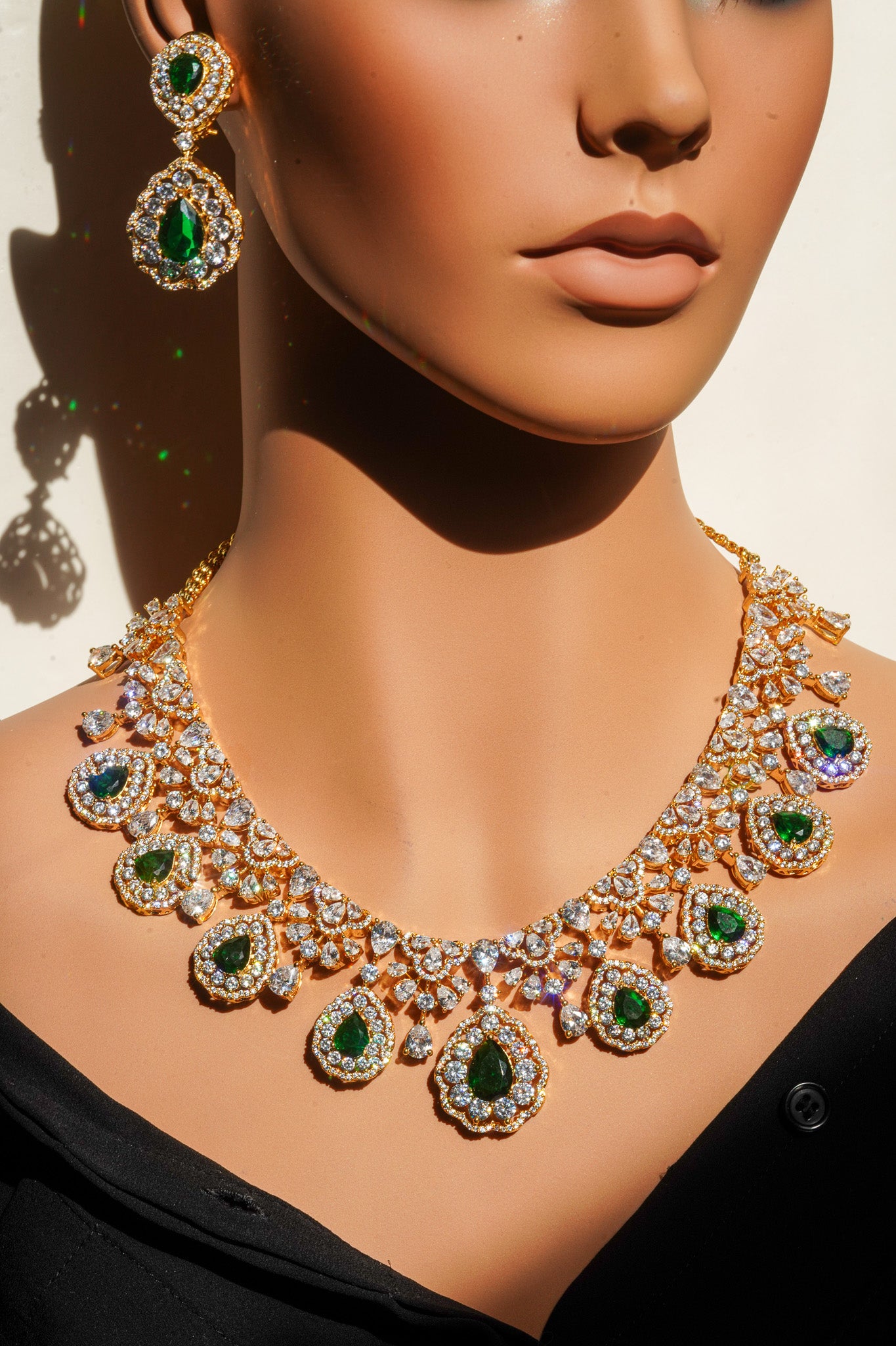 - Gold Plated Finish with Emerald Green Stones: As pictured. This rich, traditional pairing features a brilliant gold setting showcasing deep, vivid emerald green teardrop and pear-cut stones, encircled by dazzling clear diamantes.