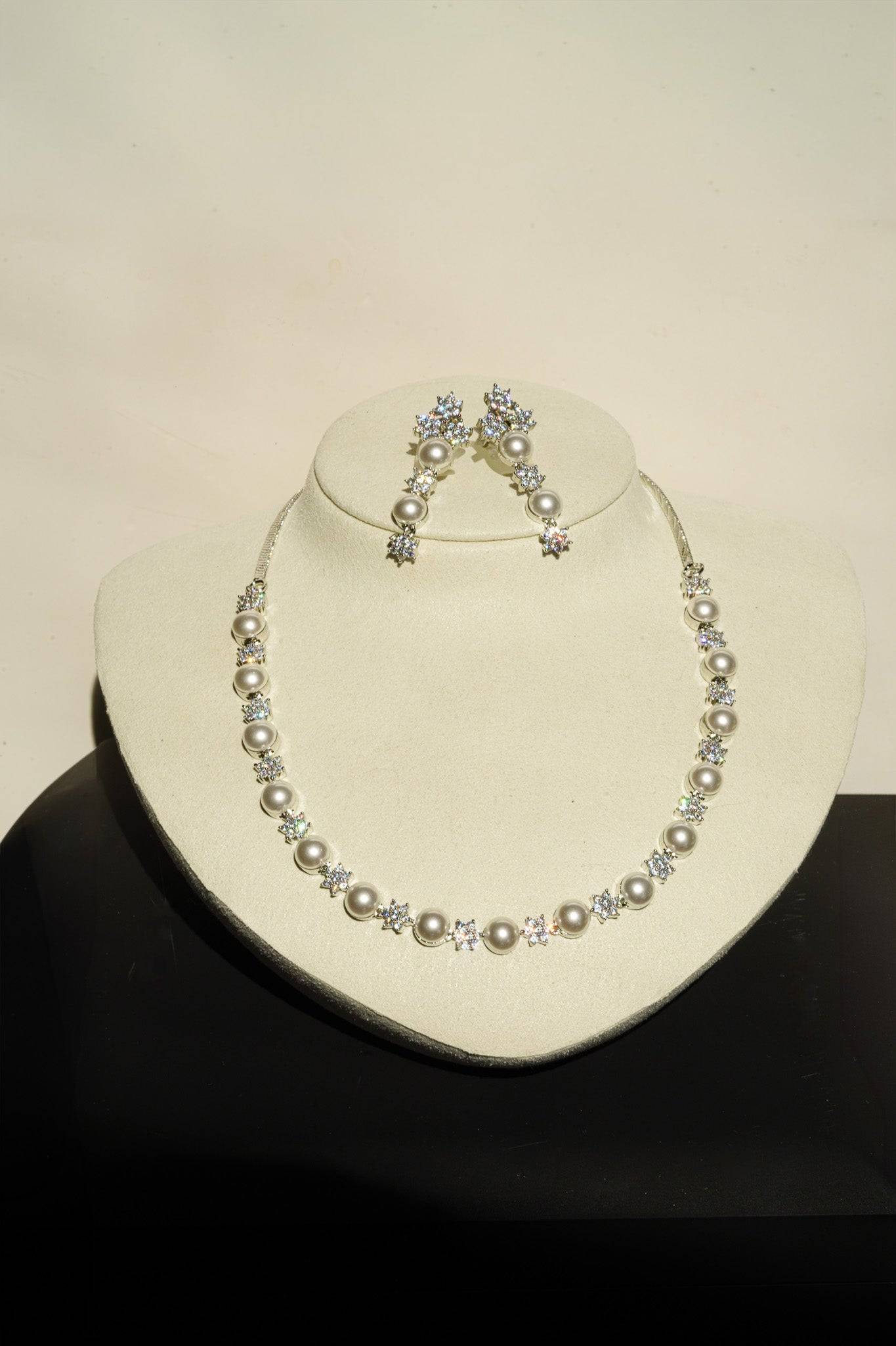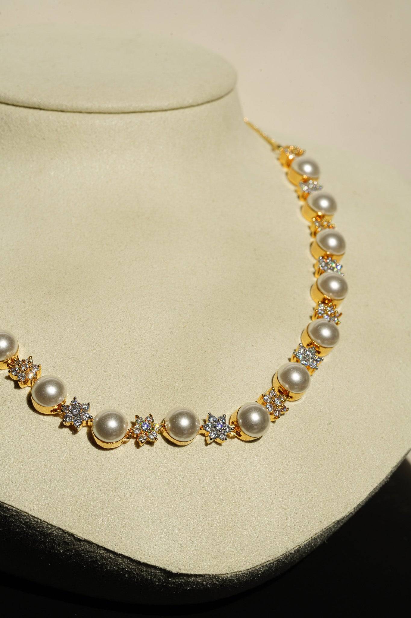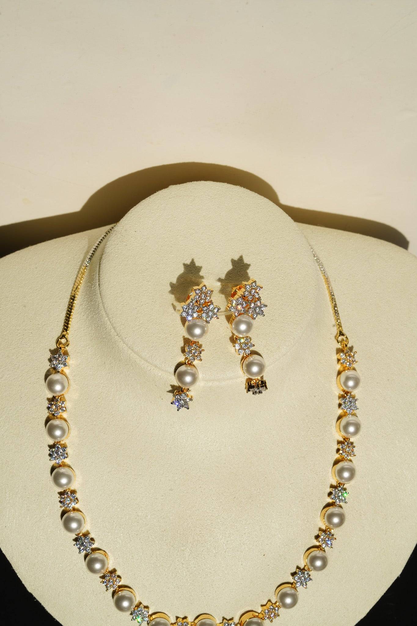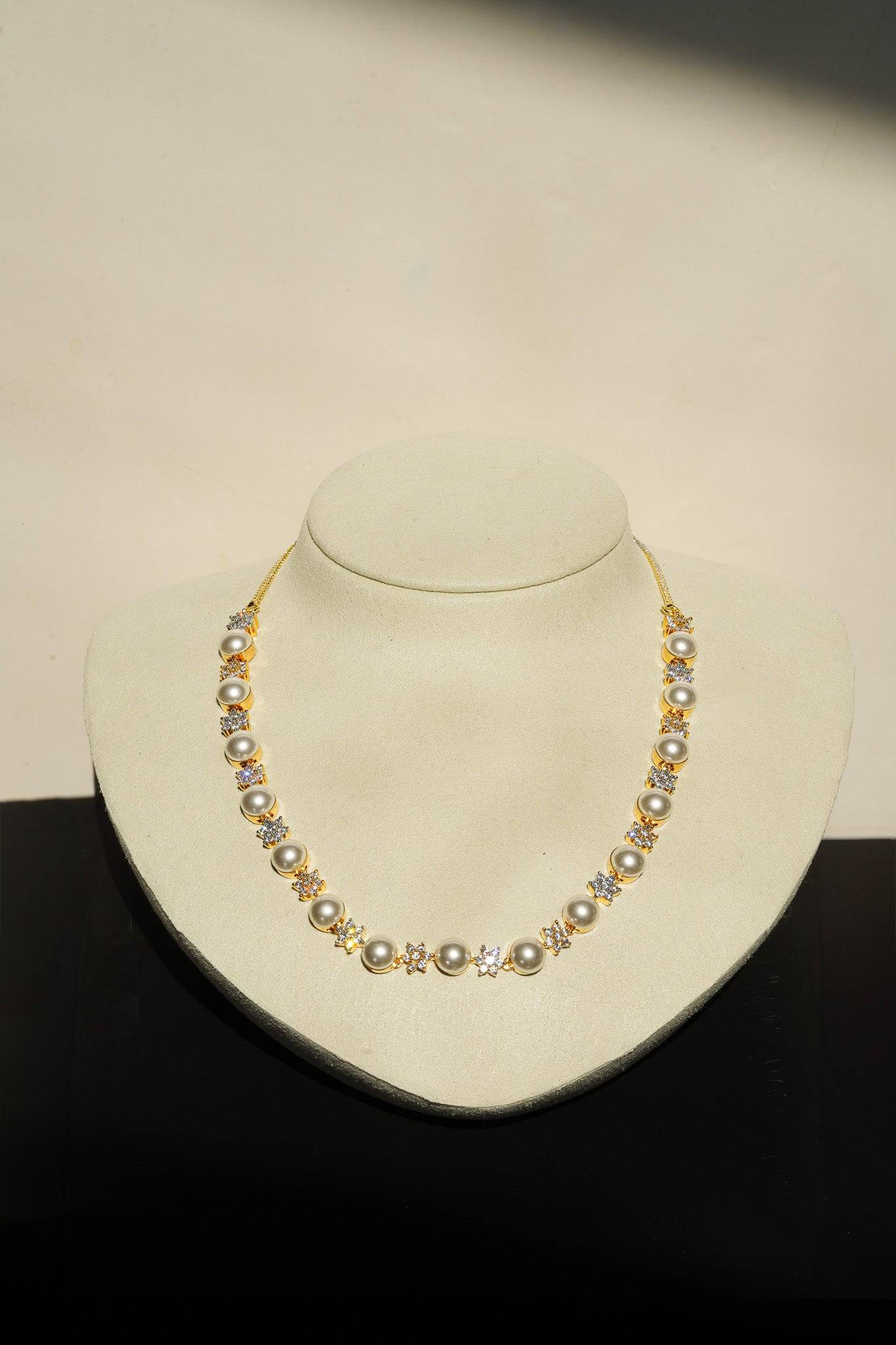 The necklace features a continuous, symmetrical arrangement of lustrous faux pearls alternated with dazzling, star-shaped AD clusters. This design provides continuous sparkle while retaining the classic silhouette of a single-strand pearl necklace.