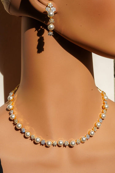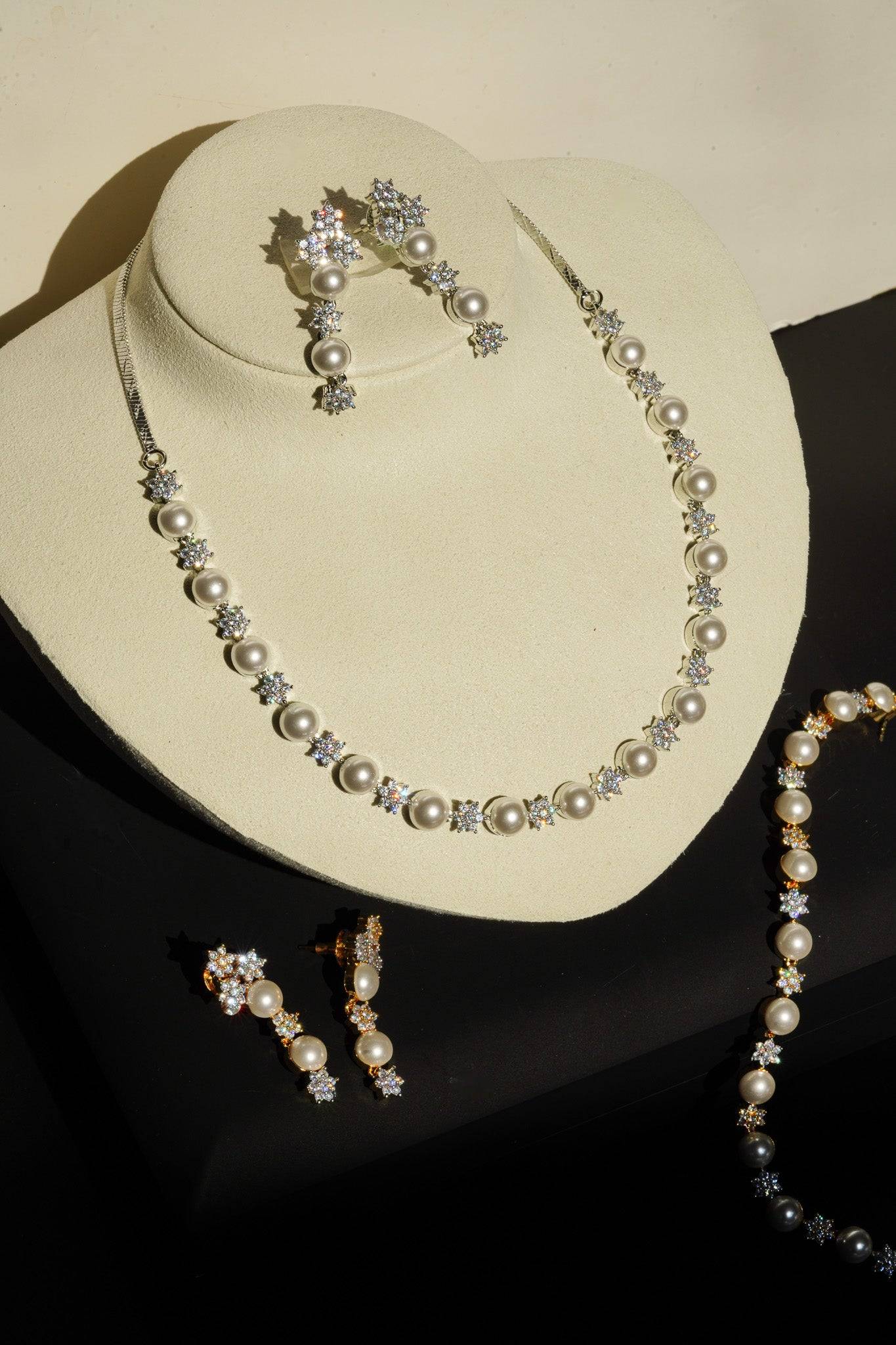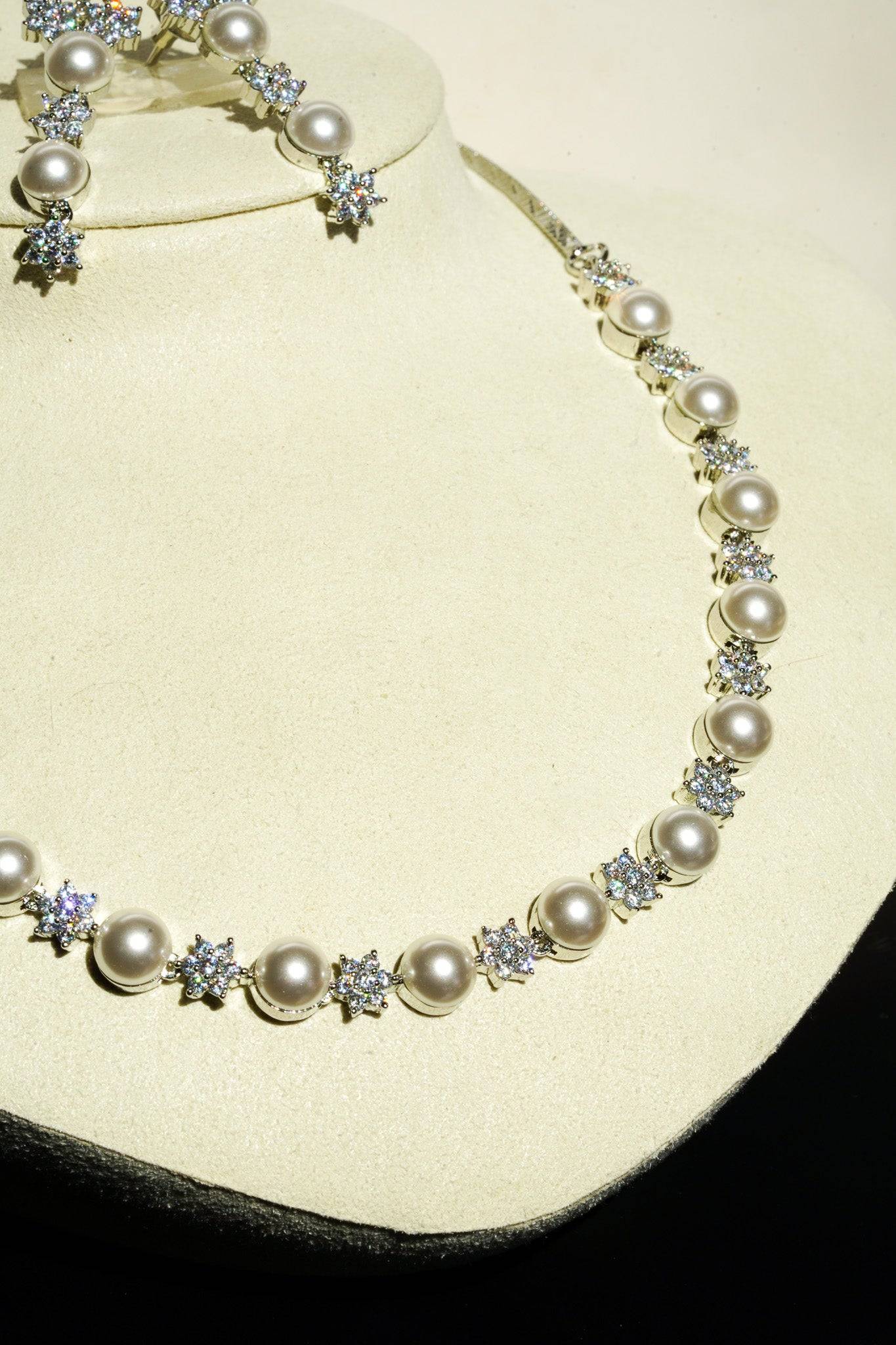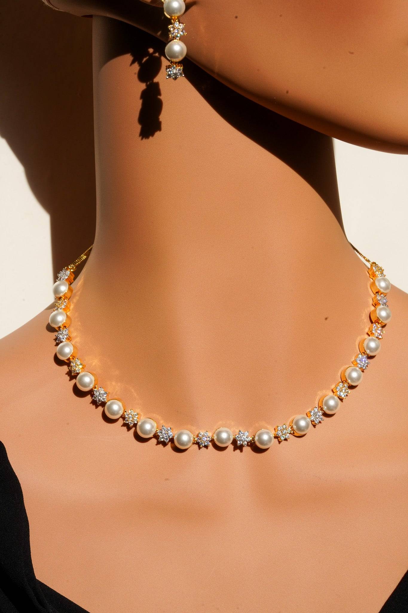 The necklace features a continuous, symmetrical arrangement of lustrous faux pearls alternated with dazzling, star-shaped AD clusters. This design provides continuous sparkle while retaining the classic silhouette of a single-strand pearl necklace.