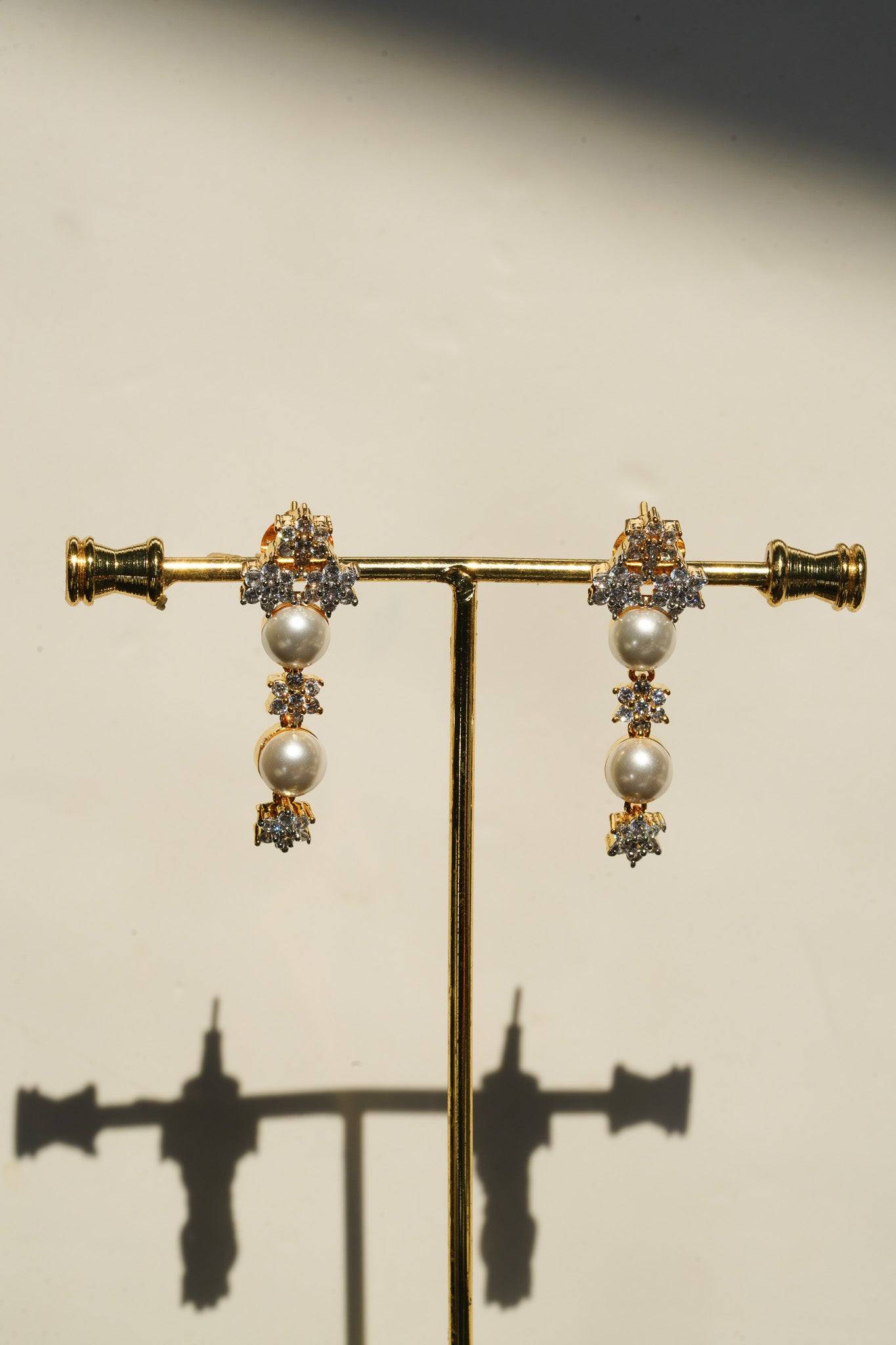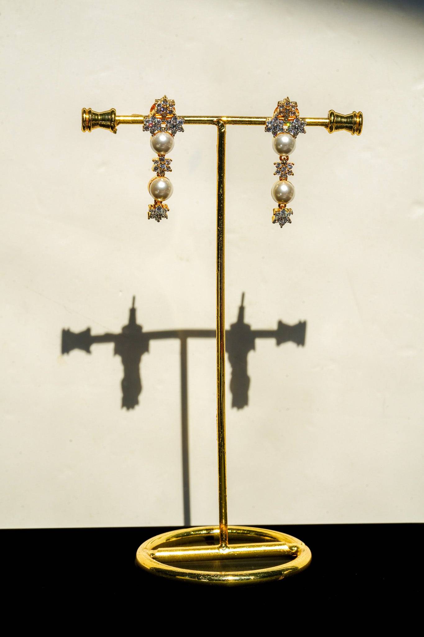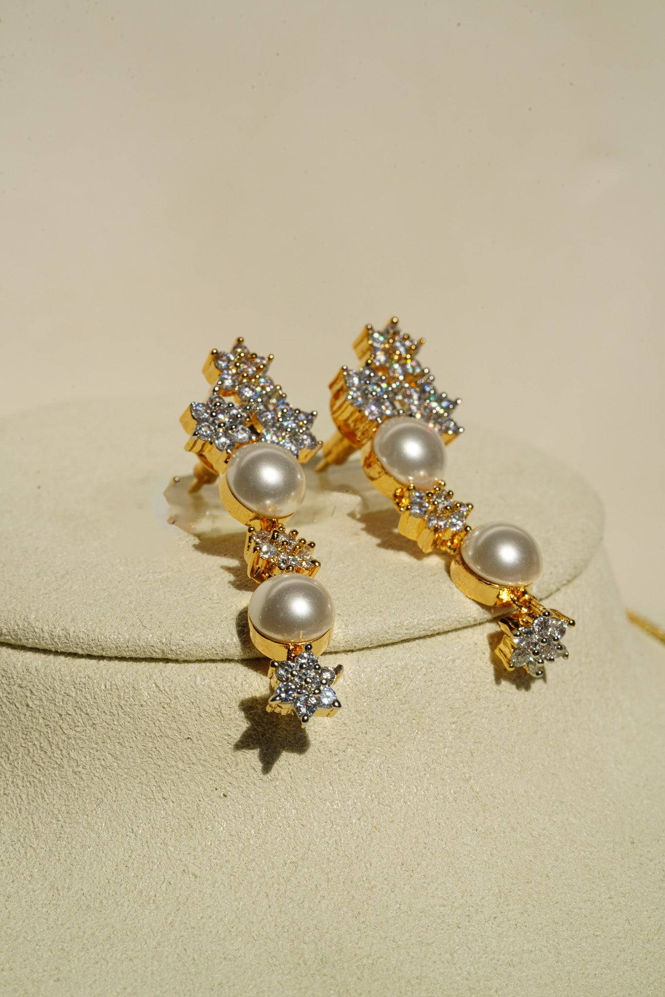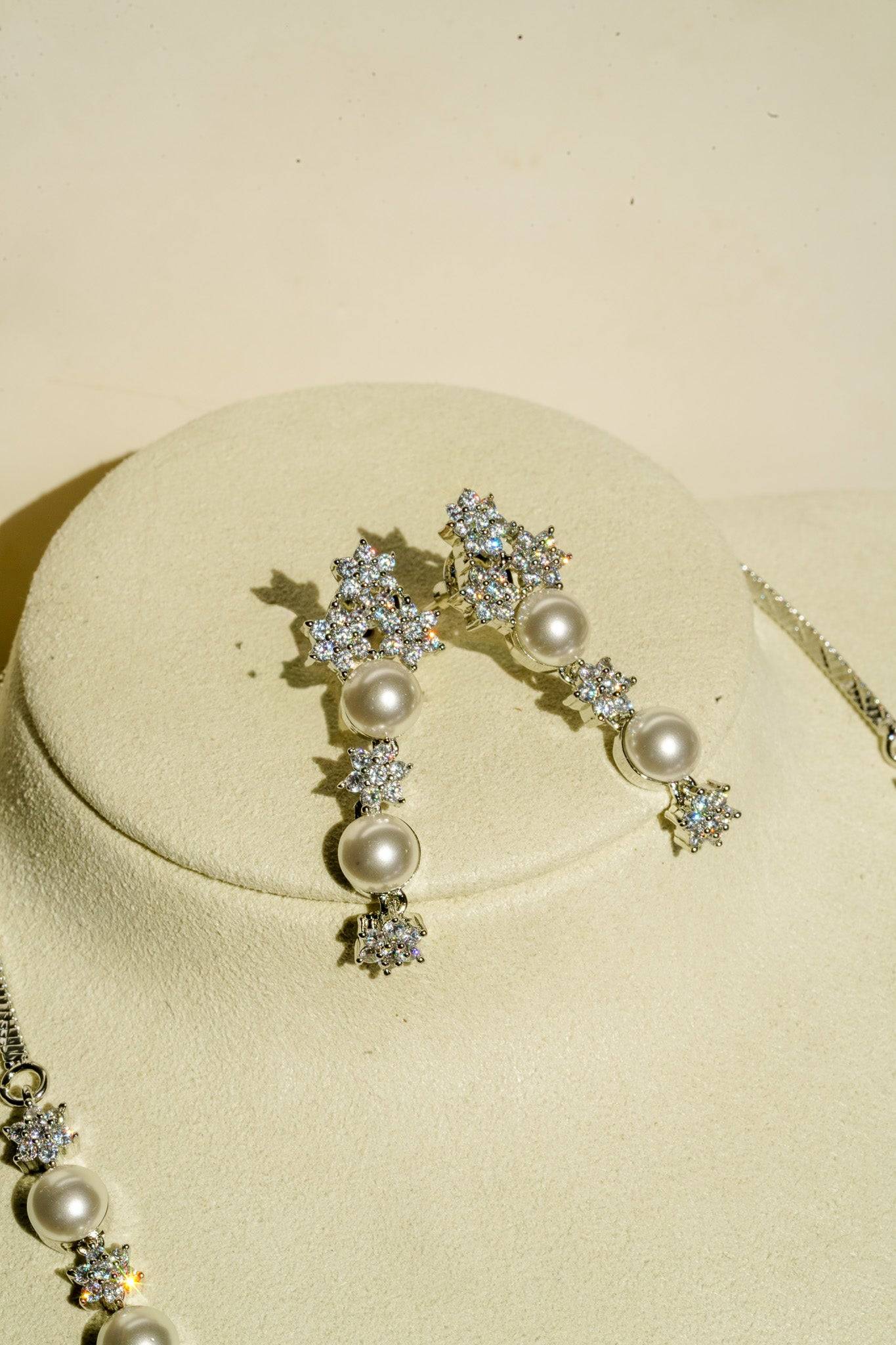 The necklace features a continuous, symmetrical arrangement of lustrous faux pearls alternated with dazzling, star-shaped AD clusters. This design provides continuous sparkle while retaining the classic silhouette of a single-strand pearl necklace.