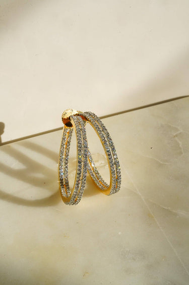 The inner and outer faces of the hoops are meticulously paved with brilliant clear AD (American Diamond) or Zircon stones, ensuring maximum light reflection and dazzling brilliance from every angle. With a comfortable drop of approximately 1.6 inches (4 cm), they are substantial enough to make a statement yet lightweight enough for all-day wear.