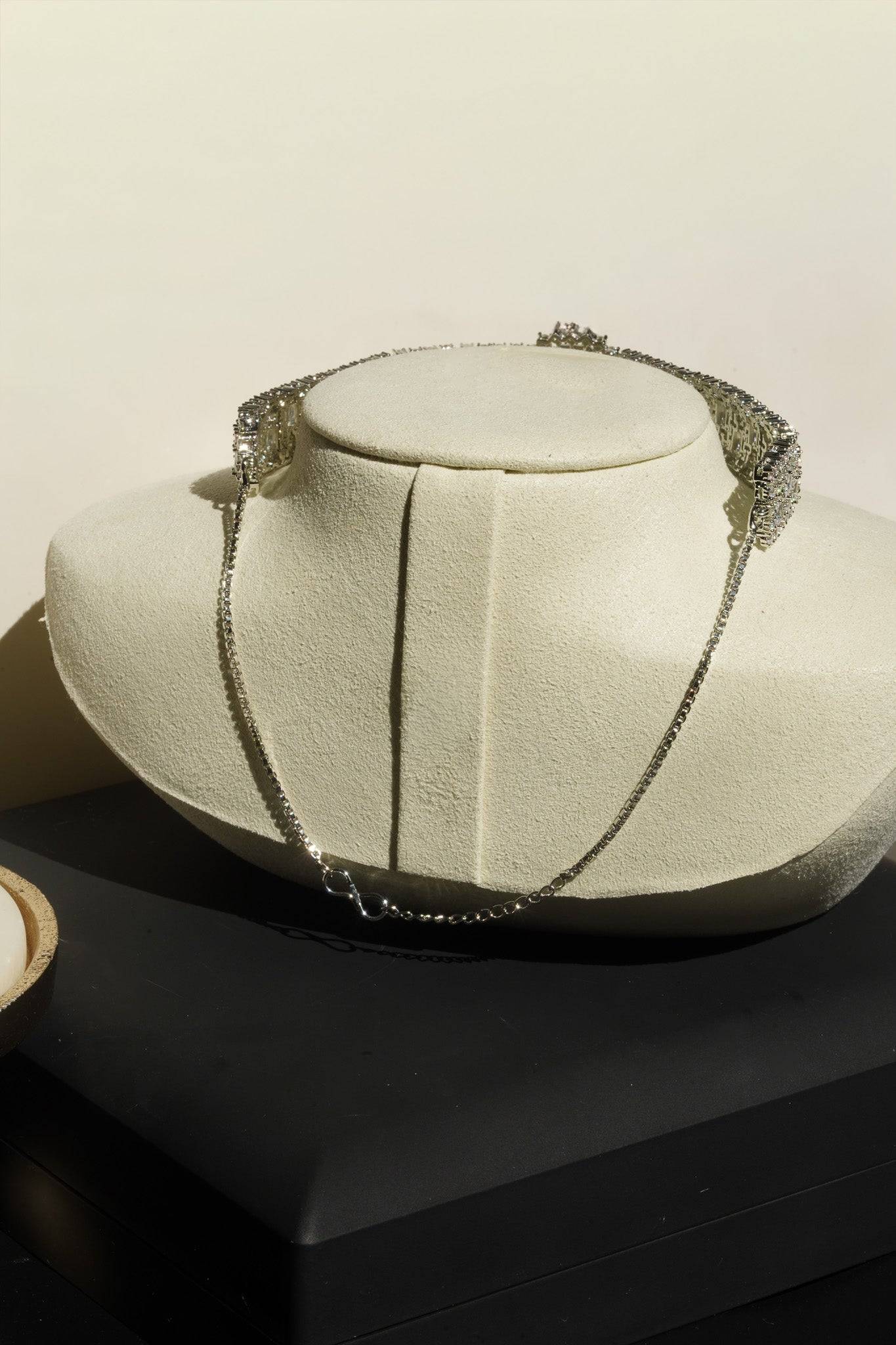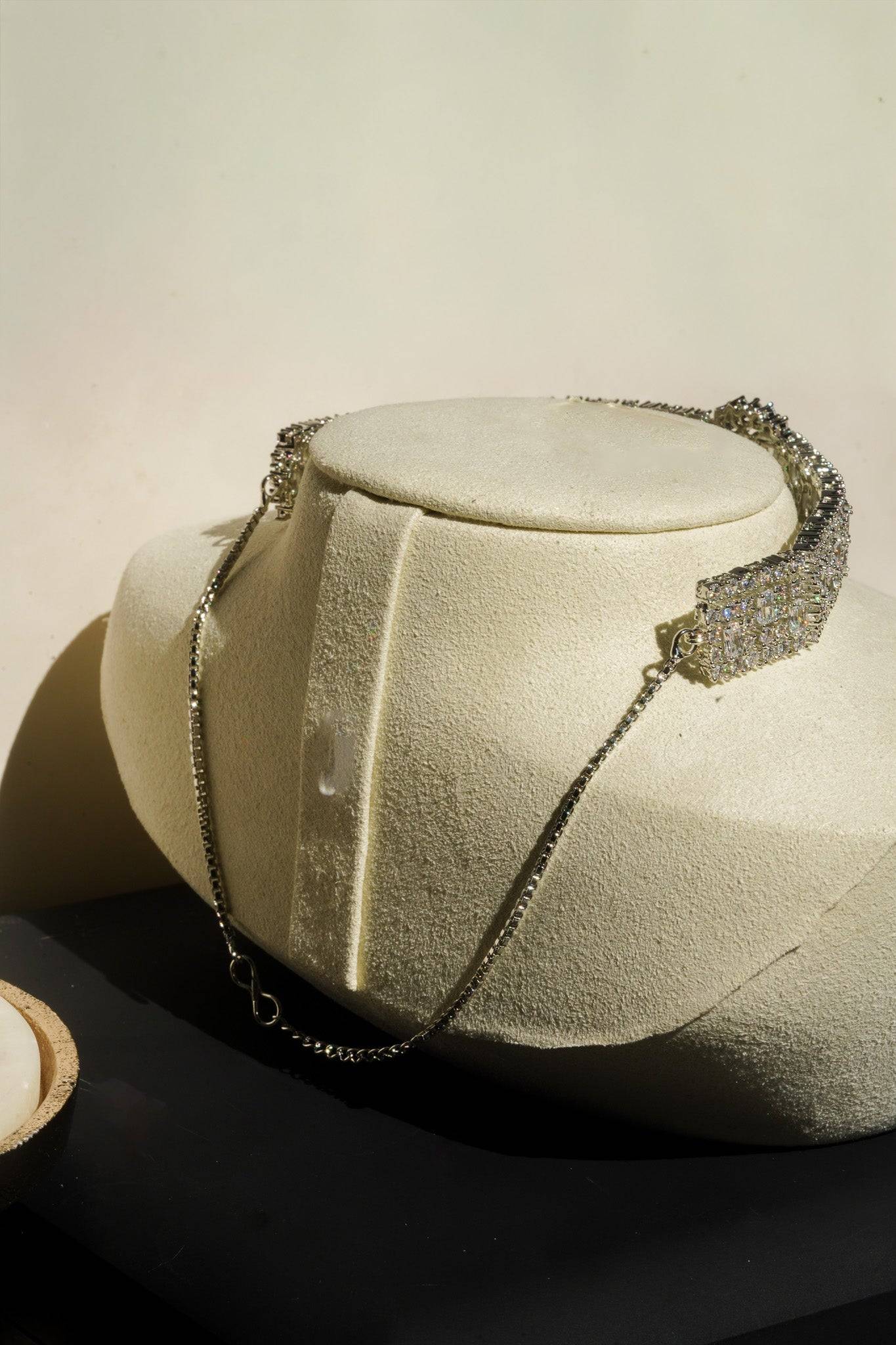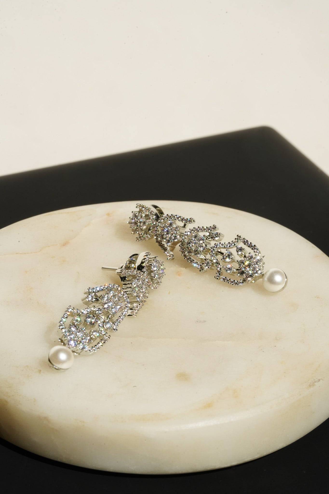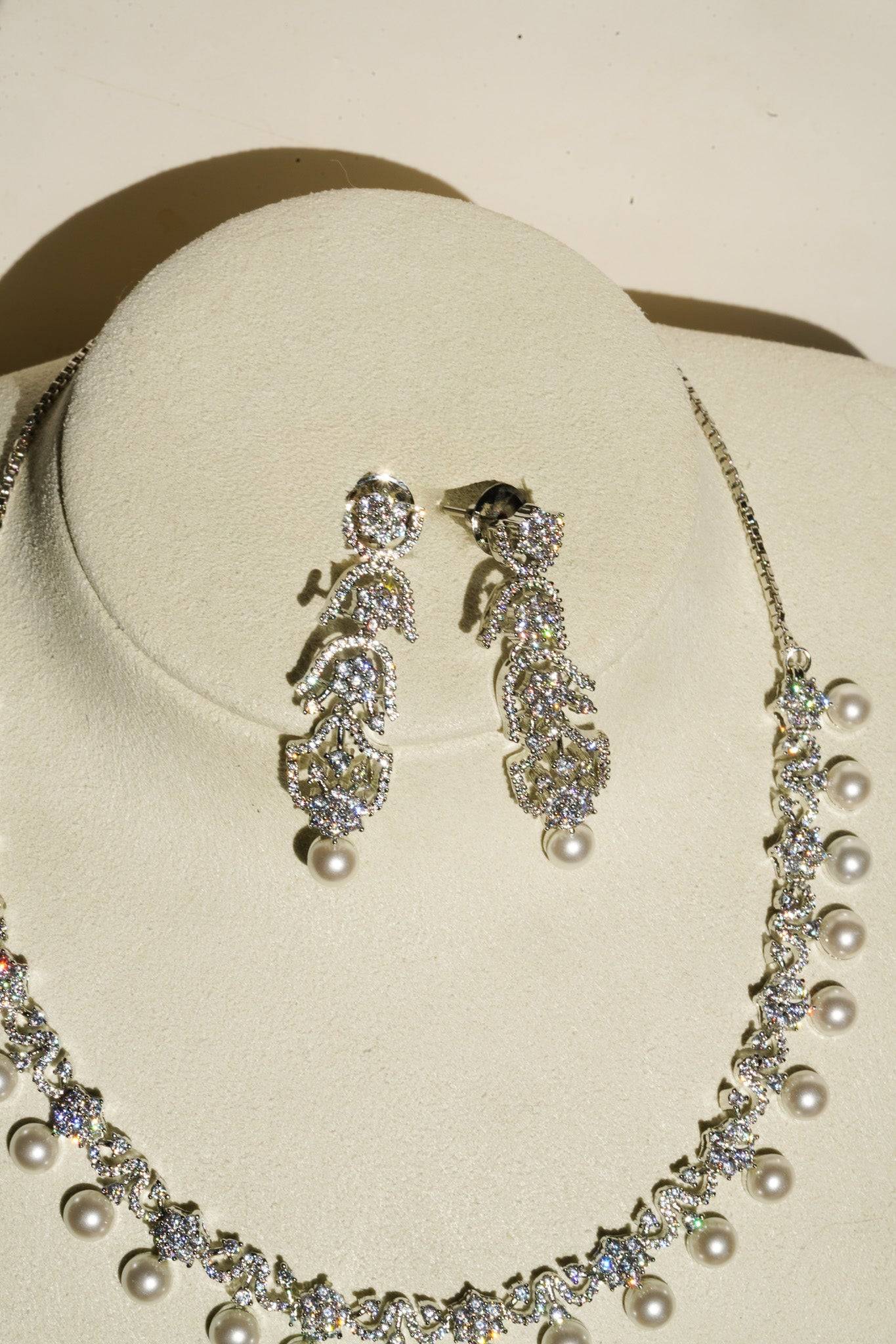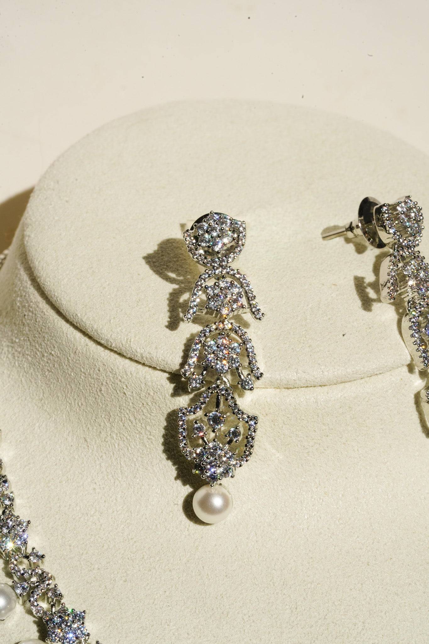 The entire set is plated in brilliant rhodium for a flawless, high-shine, silver-tone finish that offers magnificent diamond-style brilliance. The delicate necklace features intricate clusters of clear AD (American Diamond) stones in a beautiful floral and vine motif, with each segment accented by a single, lustrous faux pearl drop.