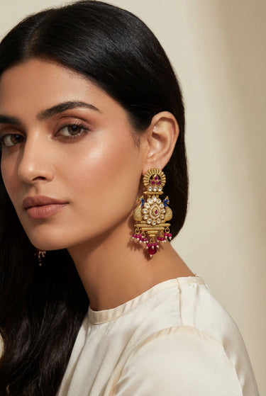 Styling Note: The Adrita's scale and color palette — deep ruby, cobalt blue, and gold — calls for restrained styling everywhere else. Pair with a deep red, ivory, or forest green lehenga or silk saree. Keep the hair up in a bun or sleek chignon to let the full four-tier drop be visible. Skip the necklace — the Adrita is a solo act. For a fusion bridal moment, wear with an ivory embroidered kurta set and let the earrings carry the entire look.