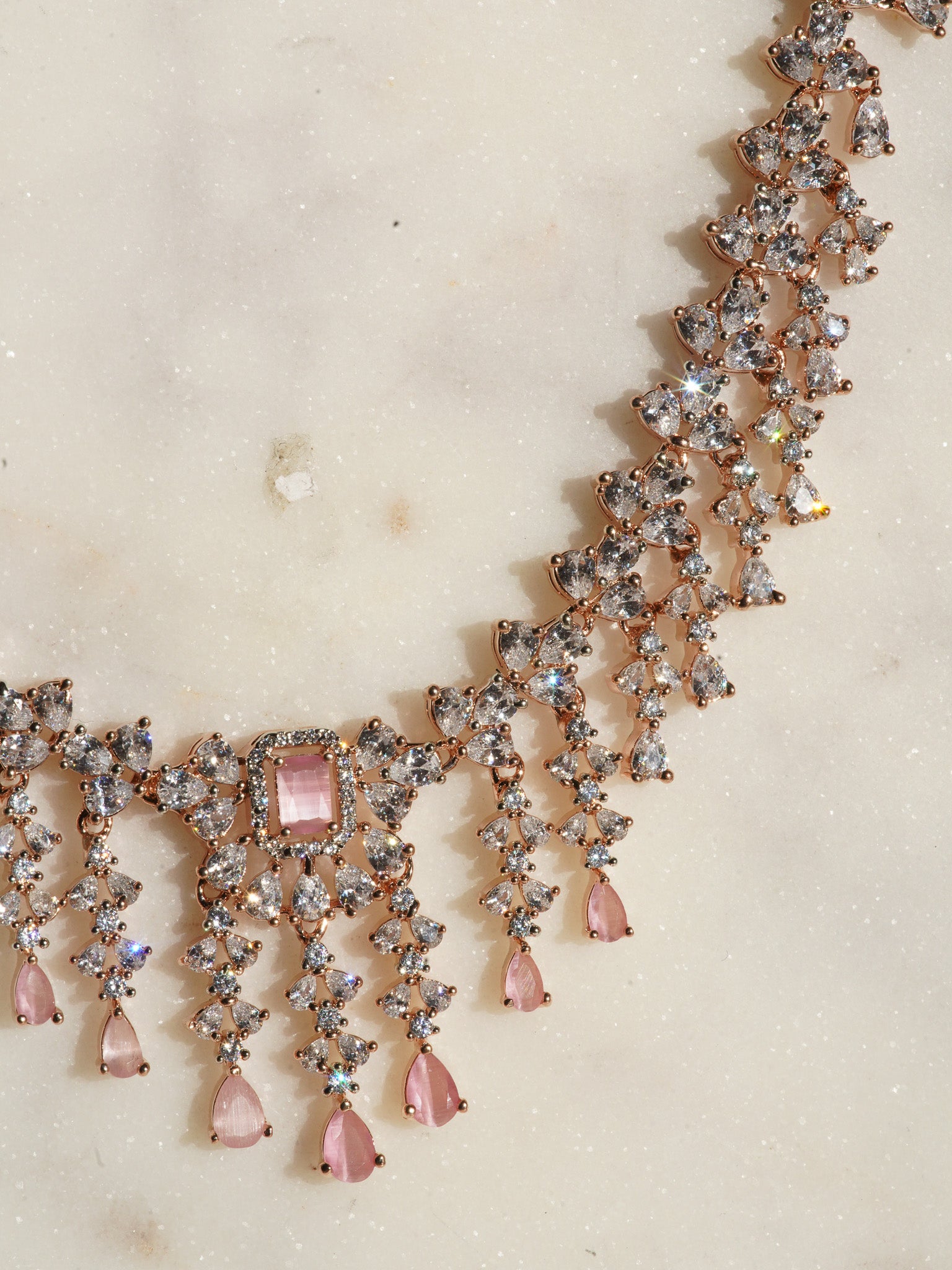 Indulge in the timeless allure of the Anne Diamante Accent AD Necklace Set. This rose gold plated necklace set is available in five captivating color options: rose gold and white, rose gold & pink, rose gold & green, rose gold & sapphire blue, and rose gold & maroon. This exquisite necklace set features a cascading design with a delicate pattern filled with diamante accent AD stones. Paired with dainty earrings, the set embodies an elegant and minimal aesthetic, making Anne a perfect expression of sophistication in contemporary jewelry.