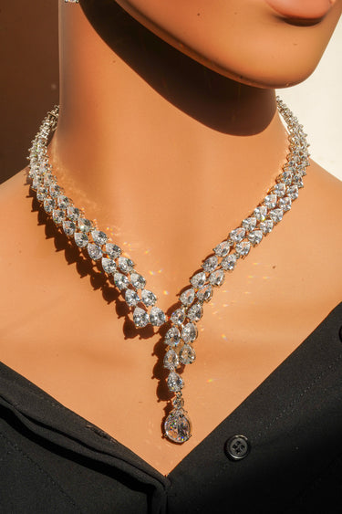 Finished in brilliant rhodium plating for a cool-toned silver shine, this South Asian lariat set features a dramatic V-shaped drop pendant that adds refined glamour perfect for receptions, formal events, and Indo-Western styling. The coordinating drop earrings echo the necklace's pear-cut detailing—delivering high-jewelry elegance with lightweight comfort for all-day wear.