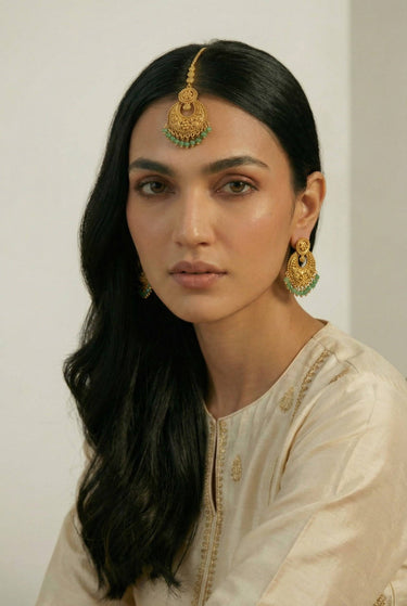 Styling Note: The Gurleen set is at home with an ivory or cream silk kurta set, a mustard or deep green lehenga, or a classic red bridal ensemble. The emerald green drops make it particularly stunning against warm gold and ivory tones. Wear the hair in a center-parted sleek blowout or low bun to show the maang tikka to its fullest. The earrings are a complete look on their own too — wear just the chandbalis with a simpler look for a mehndi or Eid day outfit.