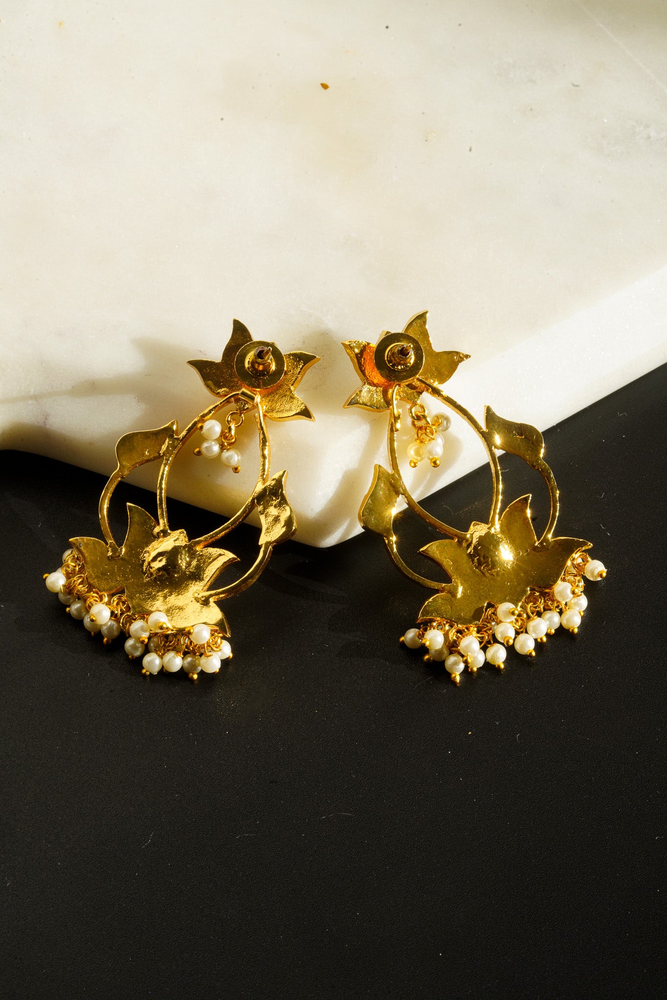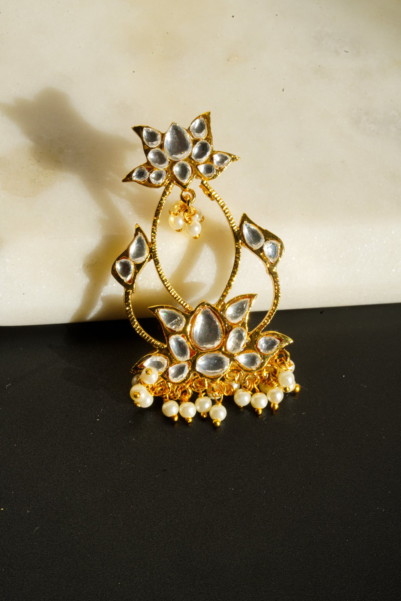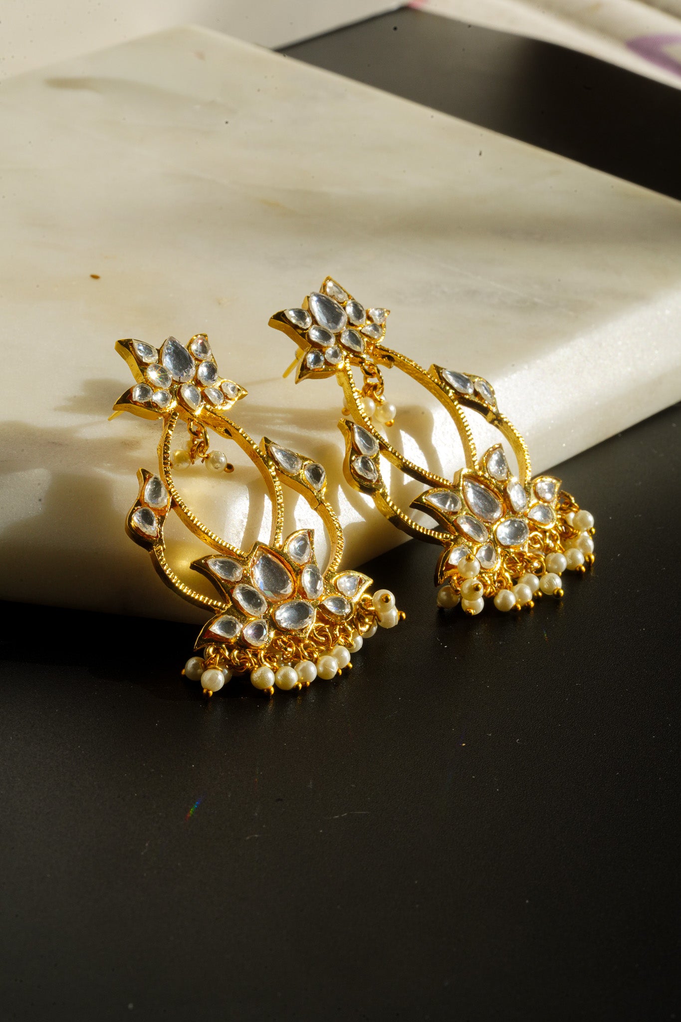 Step into the world of regal heritage with the mesmerizing Inaury Talia Earrings. Named to reflect blossoming beauty, these exquisite earrings feature the coveted Kundan (Polki-style) look, embodying the intricate craftsmanship of traditional Indian jewelry. The earrings are beautifully plated in a rich gold finish and designed in a sophisticated, open-work lotus or floral motif.